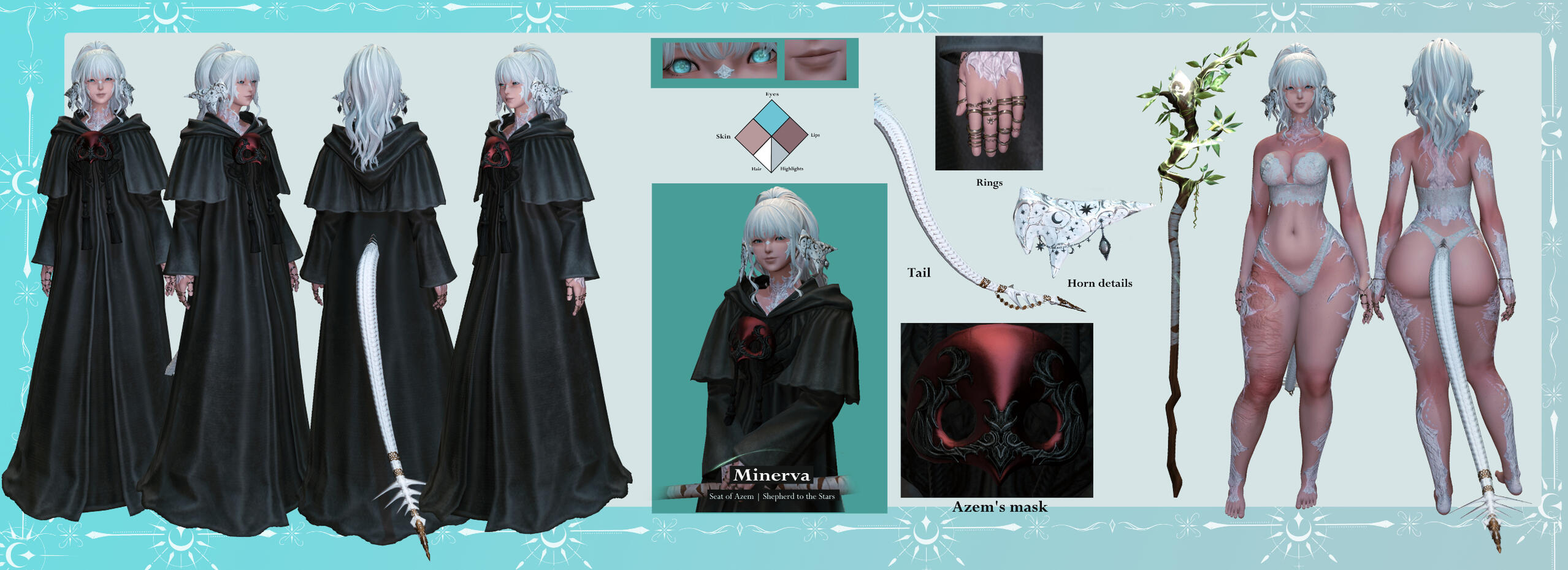 Many millennia ago, the unsundered soul of the Warrior of Light belonged to a powerful mage known as Minerva, who would succeed Venat and hold the Seat of Azem.Minerva's origins are unknown to her. When she was barely five summers old, she was taken to Amaurot after an accident left her the only survivor from a clan of people that worked as Druids in the far north. She was found by an Amurotine couple, who took her into their care. Minerva barely remembers anything before being adopted - her earliest memories being when she was brought to Amaurot and meeting a young Hades and Hythlodaeus the very same night. Growing up, Minerva had always felt like an outcast. As a child, she was the embodiment of chaos - causing mischief and trouble whenever she could. Minerva knew always had unique features. Pearlescent white scales, a tail and horns. She didn't know why, but it often lead to her questioning her origins as her parents didn't have any of the same features. As fate would have it, she would never have the chance to speak with them and hear the true story of her adoption, as they chose to return to the Star when she had barely turned twelve summers old. The loss of her adoptive parents added to the buried trauma of losing her birth parents. She was left in the care of Hades and Hythlodaeus' families, and would inherit an apartment from her adoptive parents when she came of age.The trio were inseparable. Developing a severe fear of abandonment, Minerva clung onto both of them and refused to bond with anyone else. This often led to fights as a child, which followed her into adulthood and also led to an unhealthy attachment to Hades and Hythlodaeus. Whilst they didn't mind one bit, they knew it would be hard for Minerva to adapt once both of them took on new roles in their society - Hythlodaeus as Chief of the Bureau of the Architect and Hades holding the Seat of Emet-Selch within the Convocation of Fourteen.Regardless, they still made time for Minerva whenever they could, and the trio would enjoy each other's company when time allowed them. When her friends were very busy, Minerva would find herself drifting to Elpis to find some peace within her mind. To Minerva, it was better than the alternative - finding temporary relief through one night stands, which she often gave into when her mental health dipped too far.It was her time in Elpis that first introduced her to Venat, and through Hades, Azem learned to let Venat in as a friend. Through Venat's work as the previous Azem, she would share stories of her travels with her soon to be successor. It was through these stories that Minerva learned about different civilisations across the Star, and began to wonder if there others who looked like her out there in the world. Listening intently to Venat, Minerva slightly envied just how free Venat's role sounded, and hoped one day she could feel as free as Venat did.Seeing the potential within Minerva, Venat stepped down from her role and elected Minerva to take on the Seat of Azem. Minerva spent many moons training with Venat, besting her with her exceptionally powerful magic that was on par with Hades. Through vigorous training, Minerva joined Hades in the Convocation of Fourteen holding the Seat of Azem.Minerva thrived within her role. Travelling across the Star and getting to know the people within it helped her with accepting herself. Her headstrong and stubborn nature causing as much mischief and chaos as before - despite Hades' protests for her to stop and think before she took on the problem. Despite Minerva thoroughly enjoying her role, there was still tension between herself and other Convocation members; constant arguments and increasing tension which often caused Minerva to feel isolated as the tension bled into her friendship with Hades.Hades and Minerva's friendship grew more strained as the the unknown calamity known as the Final Days grew closer. Minerva desperately tried to cling onto any remnants of their friendship, but the pressure of both of their roles strained their friendship further - especially for Hades, who was trying to keep the relations between his dear friend and the rest of the Convocation in one piece. Minerva felt like she was slowly losing one of her best friends, and to add even further complication, Minerva was certain her feelings for both Hades and Hythlodaeus were growing into something more. She didn't know how to handle it, not with the constant arguments with Hades over the summoning of Zodiark - something Minerva refused to be a part of.Feeling isolated and alone, Minerva sought comfort with Hythlodaeus one night, which led into a night of passion. It was in that moment, where Minerva finally felt safe enough to do so, that she confessed her feelings to Hythlodaeus about both him and Hades, but feeling afraid about what to do. Hythlodaeus confessed the same, but with the Final Days approaching, they both felt it would be best to speak to Hades once they figured out what to do.That talk would never come.As Minerva continued to delay the Convocation summoning Zodiark, the other members forced a vote to outcast Minerva from her Seat - with only Hades and Themis opposing the vote. Lahabrea forced the final word, stating that she would doom them all if she delayed the only salvation of the Star, and thinking it would be kinder on her, Hades volunteered to deliver the news.Minerva had never felt such a feeling rip her apart as Hades' betrayal. Angry, heartbroken and on the verge of lashing out - Minerva ran and left Amaurot behind.Minerva spent the lead up to the Final Days helping as many people as she could, shepherding them away from places that were already affected, but soon enough, she would realize with a broken heart that all her efforts would be in vain. When the Final Days arrived, Minerva found herself back at Amaurot in one last, desperate attempt to rescue Hades and Hythlodaeus. Minerva would find herself too late, as Hades delivered the news that H