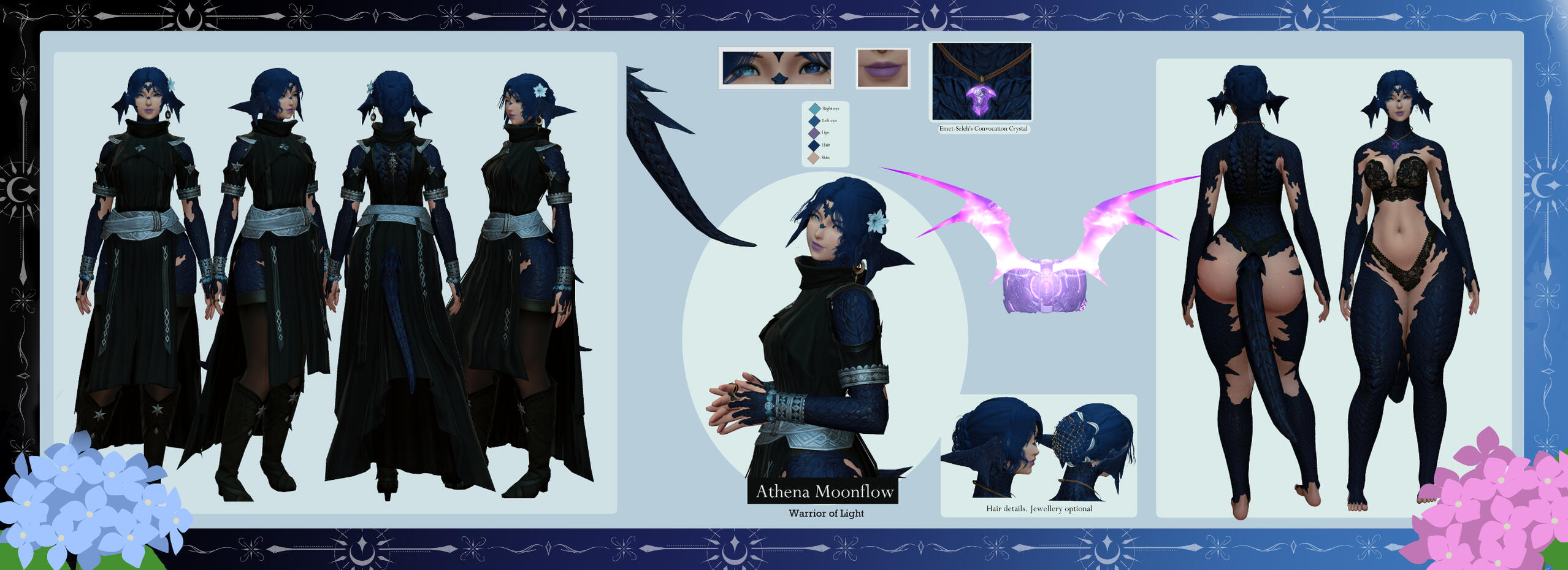 Five years after the Seventh Umbral Calamity, the land begins to repair itself, and so is the beginning of Athena's journey.Upon hearing about the progress of the land, Athena's father wished to journey back to Eorzea; partly to see the land's progress, and partly to research what remains of Carteneau, but the wounds from his battle five years prior prevent him from being healthy enough to do so. Not wanting her father's wish to go unfulfilled, Athena decides to travel in his stead, and hoping that she would also seek answers about her strange dreams and visions, which have now gotten more frequent. Her parents are supportive of her decision, and help prepare her for the journey ahead. Her mother equipped her with a sword to help protect herself on her journey, and her father bestowed upon her his very first grimoire; a relic filled with innate knowledge and information on the use of magic, hoping that one day, Athena could train herself into a powerful mage.Athena left the Steppe to board a boat in Kugane that would lead her to Eorzea, and there she would take on a new name to signify a new part in her story, a story that would become her own. She was now known as Athena Moonflow.Arriving in Ul'dah by chocobo carriage, Athena established herself quickly as a keen adventurer. She registered with the Gladiator's guild to hone her skills with the sword her mother gave her, but she hoped that she could train in magic one day. Through her good deeds and the show of her Echo, she was noticed by Thancred, who befriended her and eventually led her to the Scions of the Seventh Dawn. It was here that she met Minfilia, another blessed with the powers of the Echo, and they became quite close through their shared powers.Athena's name quickly became known throughout her Eorzea; her slaying of Primals without fear of tempering soon granted her the title the Warrior of Light - something which caught the eye of a different enemy, the Ascians.Thancred's possession by the Ascian Lahabrea upset Athena greatly, having grown quite close to the man throughout their current travels. Resolved to save him, Athena's quest led her to the discovery of the Ultima Weapon and her confrontation with Gaius van Baelsar. Athena would emerge victorious, and bring forth the Eight Astral Era, with her title being known far wider than she ever imagined.