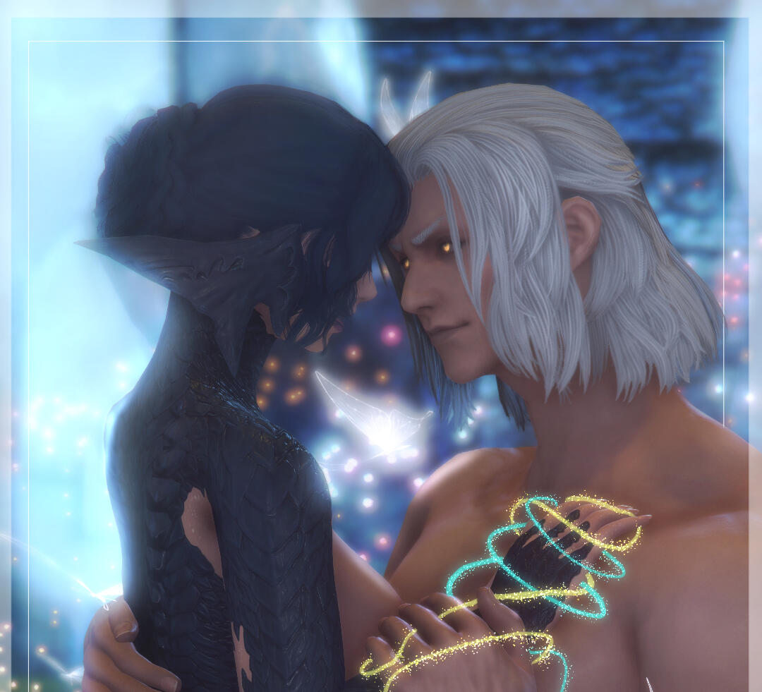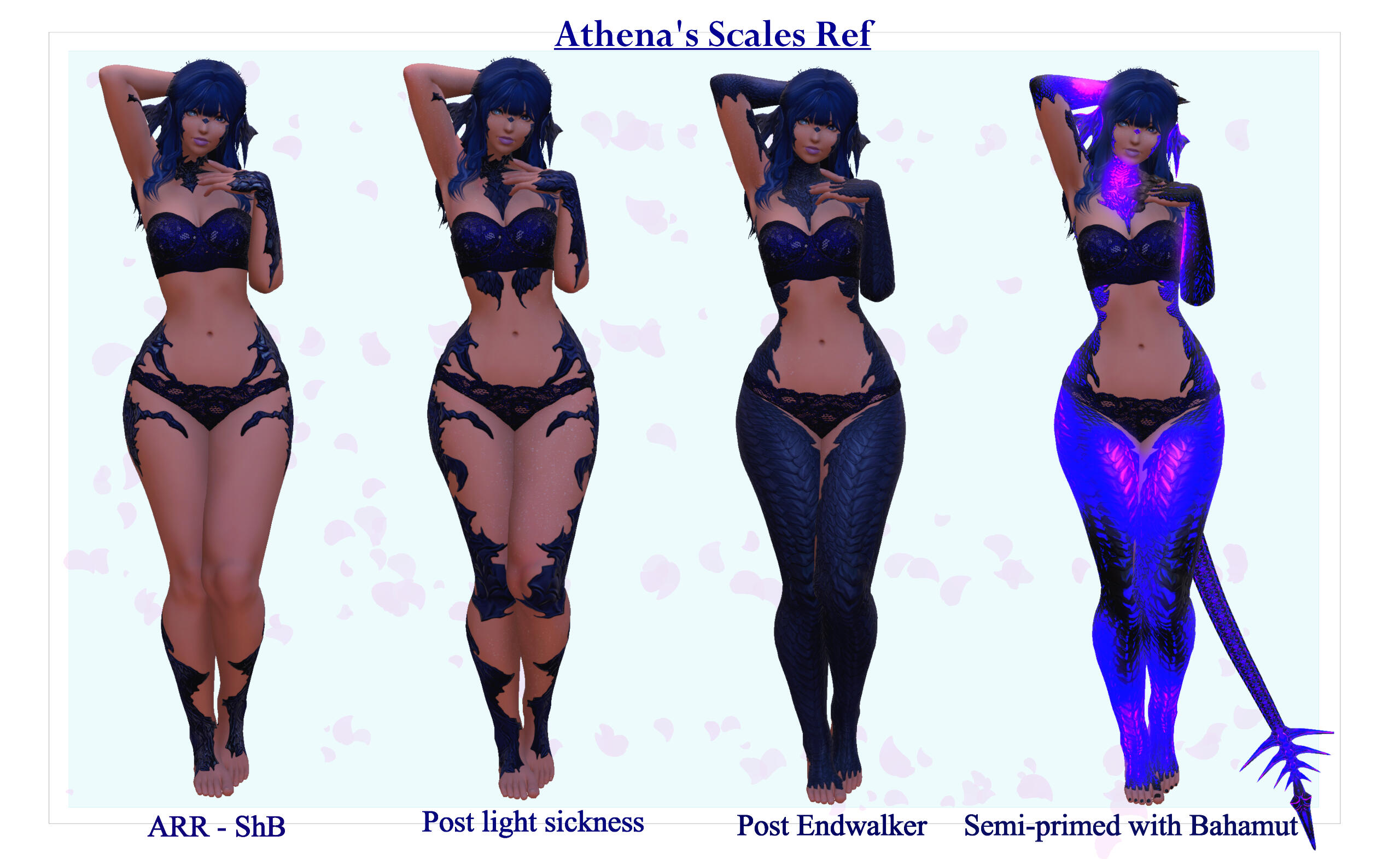 After investigating the Crystal Tower to search for the origins of the strange voice, Athena soon found herself traversing between worlds, and found herself on the First.Suffering with the plight from the Lightwardens, the Crystal Exarch pleads with the Warrior of Light to help them save the First, and Athena agreed. Reunited with her friends, Athena travelled the First to slay the Lightwardens; absorbing the Light within herself to prevent anyone else becoming the next Lightwarden, praying that her Blessing of Light continues to protect her own being from potential corruption.Their plans take an interesting twist when the Ascian, Emet-Selch, introduced himself and offered a proposition of co-operation. Ever since that introduction, Athena felt a strange, magnetic pull towards the Ascian that she couldn't explain. Determined to not let this strange feeling distract her, Athena pushed it back as best as she could, but it didn't help when Emet-Selch started showing up to her alone during her downtime.Regardless, Athena pushed on to rid the First of the Lightwardens, whilst subconsciously drifting closer to her enemy. Their meetings became more regular, and Athena slowly found herself tolerating the company of the Ascian more as the time went on. As she absorbed more of the Light, subtle changes began to appear on Athena's body - her deep sapphire eyes began to lighten, her aether became more corrupted, and in the eyes of Emet-Selch, her familiar soul colour began to become muted.Athena hid her fears, determined to press on and hide just how much the Light was affecting her. Shortly after returning from Maliak's Well, Athena collapsed on her way to her chambers, and was found by none other than Emet-Selch. Seeking an opportunity, the Ascian took Athena's unconscious body to his recreation of Amaurot.She would spend a few weeks here with the Ascian, and this pivotal moment would deepen their bond to lengths neither of them anticipated. During her time in his captivity, Athena spent her time exploring the place he brought her to, driven by the strong feeling in her soul that this place was very familiar. One particular shade amongst the populace would approach her and begin many conversations when she was walking through; spurred by the familiar colour of her soul. He introduced himself as Hythlodaeus, and Athena spent many of her walks through the phantom city in his company.As Athena spent more time with Emet-Selch in this strange city, Athena started to feel like she never wanted to leave, but she knew her duty would call her back eventually. During their time together, both of them realised they had fallen in love with one another, which pained Athena even more about leaving and continuing her duty, knowing that it would force them against one another once more.Eventually, Athena returned to continue the hunt for the last Lightwarden, which took her back to Eulmore to confront Vauthry. Before her climb up Mt.Gulg, Emet-Selch confronted her and offered a chance to join him - driven by the love he felt for her, but twisted by his drive to complete his duty. Athena offered him a chance to speak after she had slain the final Lightwarden, thinking that perhaps she could change his mind. Two souls linked by love, desperate to make ends meet, but twisted by fate.After the defeat of Vauthry, Athena's soul began to shatter; the light threatening to overtake her and transform her into the next Lightwarden, and betrayed by the very man she had given her heart to when he shot the Exarch down from helping her. Emet-Selch, disappointed by Athena's failure to contain the light, offered her respite in the place where their souls connected - in the depths of the Tempest, where she could complete the transformation away from the people she loved.Ryne attempted to reverse the effects as Athena collapsed into darkness.Athena was heartbroken when she awoke. Her body had changed even more from the effects of the Light overtaking her, despite Ryne's best attempts to reverse the effects. Her right eye remained lighter shade of blue, dots of white freckles littered her body, and her scales had grown to adorn more of her body. Feeling defeated and horrified by herself, Athena thought on Emet-Selch's offer, and made for the Tempest alone.The phantom Amaurot that she come to love no longer offered her comfort, instead the Warrior of Light was filled with despair from her upcoming transformation and her broken heart. Athena and Emet-Selch confront each other one final time before the Scions catch up; one final attempt to salvage their love from the destructuin of their duties, but as they were meant to be all along, they don their roles as Hero and Villain once again. Athena's journey through the recreation of the Final Days brought unimaginable turmoil within her soul.With the fusion of Ardbert bringing her the strength she needs, Athena defeated Emet-Selch. In the fleeting moment of his form dissolving for the Aetherial Sea, the weight of her actions finally bears down on Athena as she realizes just how much she has fallen in love with Emet-Selch. As he leaves, he bids Athena to remember him and his people, and those words spark the restoration of Azem's memories. Athena breaks down as she witnesses the only person who could help her understand completely fade away in her arms.As everyone celebrates the Ascian's defeat that night, Athena withdraws to her room where she grieves for the love she killed with her own hands.