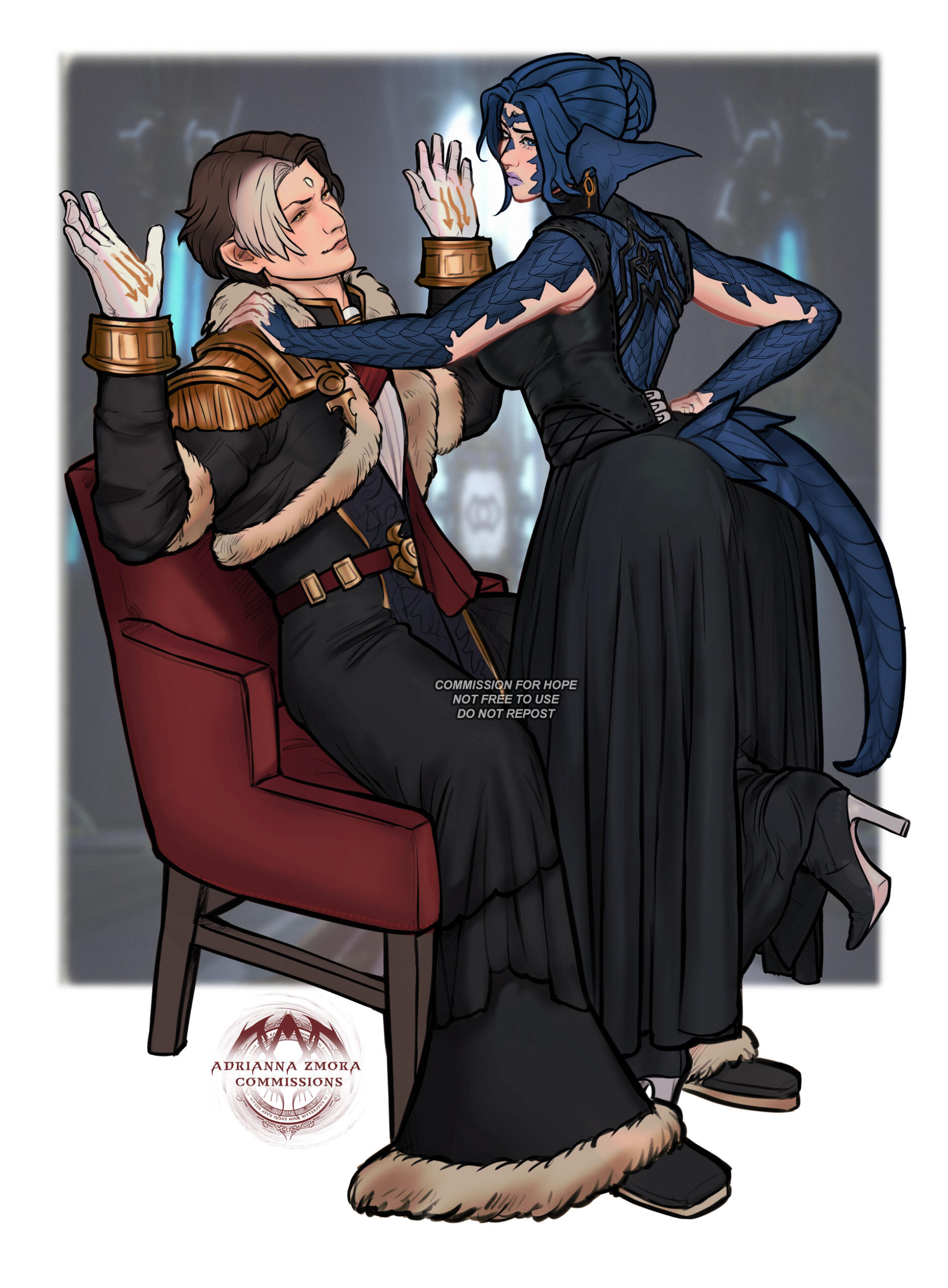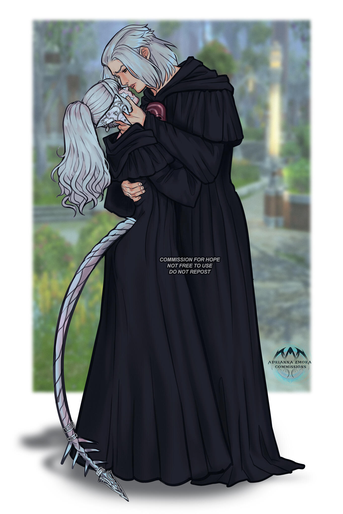 Bonded since childhood, Hades is one of Minerva's most trusted friends alongside Hythlodaeus. The first time Hades caught of a glimpse of their souls wanting to intertwine was the night Minerva was brought to Amaurot to be adopted, but being too young to understand what it really meant, Hades tried to ignore it. As he grew older, Hades learned that souls that ache to intertwine naturally are a sign of souls destined to be soulmates. Fearing that telling Minerva this would ruin their friendship, Hades chose to keep it to himself. Hades became extremely protective over Minerva after her parents returned to the Star, and that protectiveness would continue on into adulthood. The trust between them ran deeply, which helped create moments of sincere intimacy between the two - something they were comfortable with, even if they couldn't explain it to others.Despite Hades being protective, he often struggled to vocalise his concern with words. This meant it often displayed as 'tough love', which in some cases, could cause Minerva to bite back. They were both very similar in terms of being unable to voice their feelings, and that's where Hythlodaeus would act as a mediator. In most cases however, an argument and a friendly spar with magic often resolved a lot of tension - a cathartic realease that Hades would deliver with utmost care.Their friendship would go through some strain when Minerva joined the Convocation as Azem. Hades was often a mediator to prevent Minerva fighting with the other Convocation members. However, despite the constant stress she inflicted upon him, Hades soon felt his feelings begin to deepen for her. Worried about vocalising his feelings, combined with the stress of both of their roles, Hades chose to keep them to himself. If anyone were to watch him at the exact moment, often one would see the soft and sincere smile he would display just for Minerva, and despite never admitting it out loud, Hades always missed her when she was on her travels.The Final Days were growing closer, and their friendship grew more strained with the pressure of their roles, and Minerva's refusal to be a part of Zodiark's Summoning. When it was voted to forcibly outcast Minerva from the Seat of Azem, Hades fought to overthrow that vote - knowing despite their own disagreements, Minerva's work as Azem was vital for the Star, but his word was overthrown by Lahabrea. Hades volunteered to deliver the news, thinking it would be kinder on her if he did it, but seeing the absolute heartbreak on her face when did would be something that he would regret for the rest of his days.They would not meet again until the Final Days had descended upon Amaurot, where Minerva would return to try and save him and Hythlodaeus both. Their battle after Hythlodaeus' sacrifice would leave them both bloodied and broken with grief.When Hades escaped the Sundering, he watched as his dear friend carried on fighting until her soul was sundered, and he would carry that regret for many lifetimes to come. Working as the Ascian Emet-Selch, he would stumble across every reincarnation and shard of Minerva; recognising the gleam of her aqua soul no matter what form it took, and with every version he found - he would fall for them just as he fell for Minerva.Hades would continue to break his own heart as the shards perished by his own hand to bring about the rejoining - until he faltered when meeting the one reincarnation who would be his downfall - the one who was most like Minerva herself.The Warrior of Light.