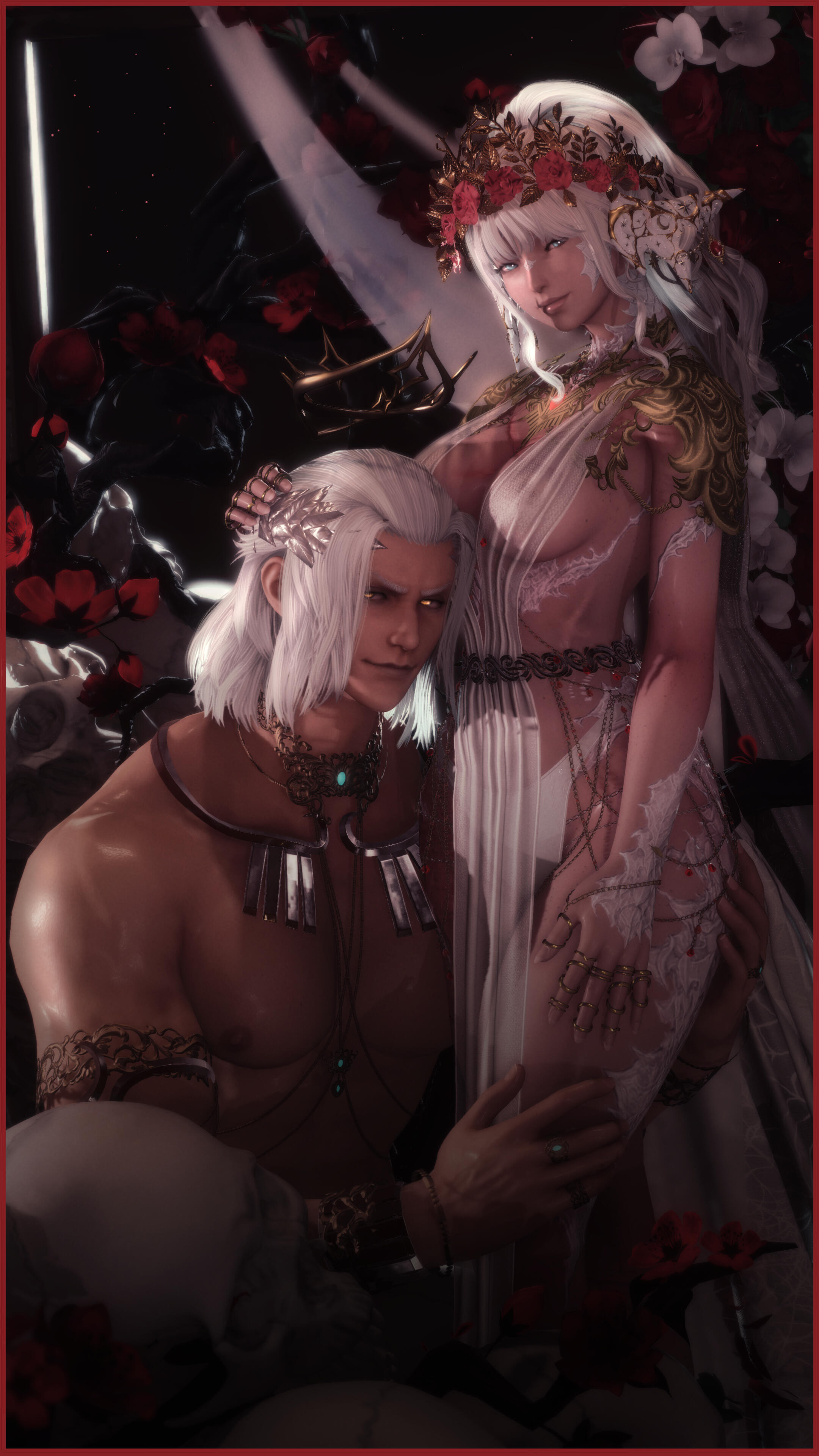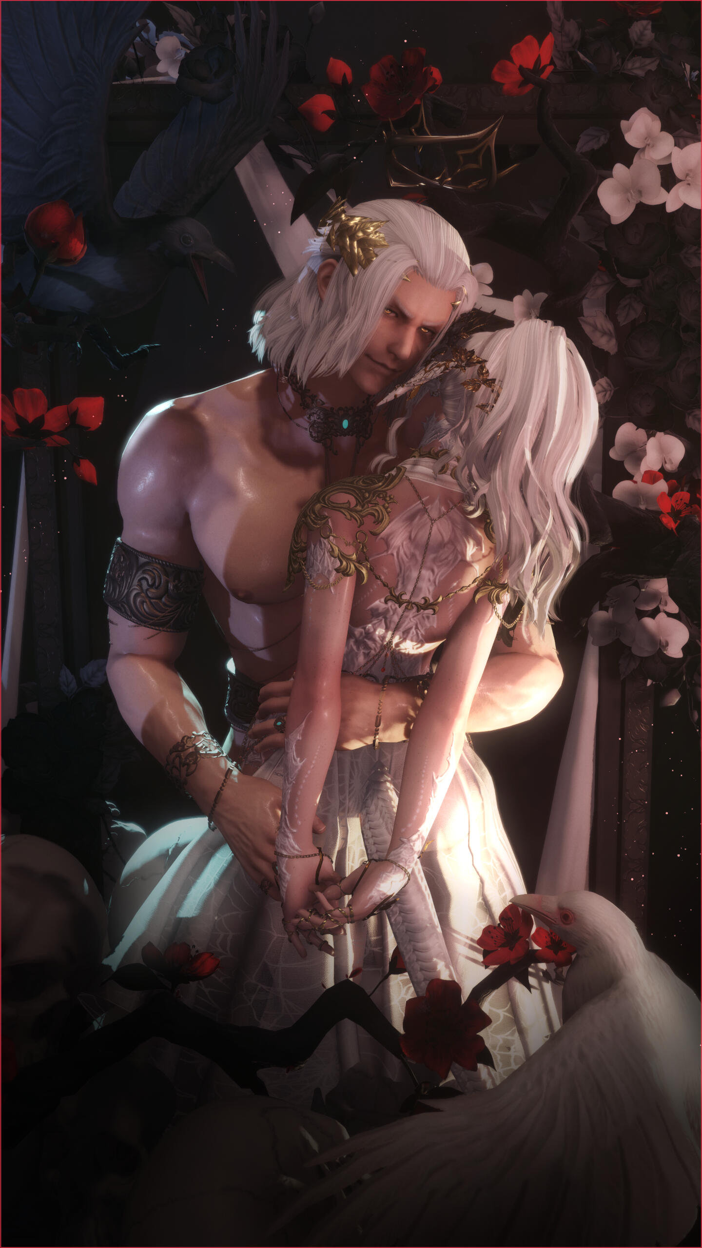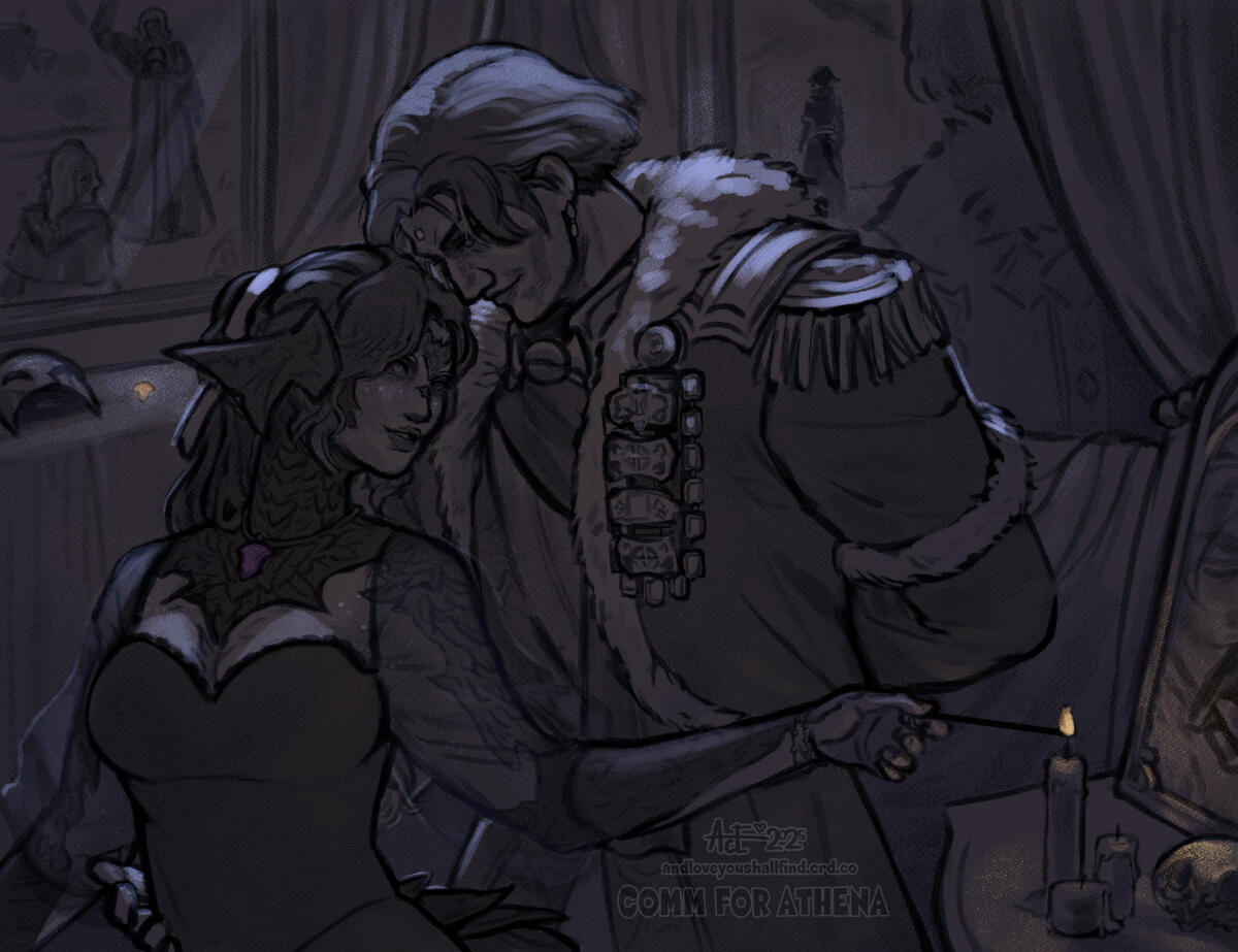 In the simplest terms, their relationship was complicated from the get go.Their first meeting was a whirlwind of emotions as they both experienced a strange pull to one another from the depths of their souls. Following this initial feeling - Athena was determined to ignore it and carry on with her duty, whilst Emet-Selch plotted to use this to his advantage, determined to slowly manipulate the esteemed Hero of the Source astray from her path.What followed was a secretive, intimate yet confusing string of meetups.Emet-Selch found himself observing Athena whenever he could, and started appearing to her during her moments of alone time. The first few meetups were met with hostility and caution; with the Ascian playing a game of how far he could push Athena's buttons. Soon enough, Athena also learned to play the teasing game of quips, and they both found themselves enjoying the company of the other, as it slowly developed into more intimate meetups where they got to know one another behind the masks of Hero and Villain. One meeting turned into several, often under the protection of the night where no one could interrupt them, and the pull between them became stronger and stronger.Regardless of their deepening bond, Athena felt guilty that she was keeping this big secret from the Scions. She feared she would be judged for 'conspiring with the enemy'. But despite the guilt, she couldn't help this strong pull she felt towards the Ascian. He began to see her for her. Not some Hero who was always put on a pedastal, but a person like everyone else. Despite the sorrow that plagued him, Emet-Selch didn't want to believe that the Warrior of Light was the shattered remanants of his dear friend, Minerva. They were complete opposites - sun and moon, day and night, chaotic and calming - but the closer he got to Athena, the more he began to see just how alike they actually were. When the Crystal Exarch began to suspect something was going on between the two, Emet-Selch proposed a new meeting opportunity - that he would whisk her away in the night to certain places in Amaurot away from prying eyes, and return her in the morning. Secretly, Emet-Selch was hoping that bringing Athena to these places would reawaken her memories as Azem, that there would be an opportunity to pull at those memories and persuade Athena to join him.Athena collapsed after the events of the fourth Lightwarden, and Emet-Selch took this opportunity to whisk her away completely, keeping her in his phantom Amaurot for some time. This was a turning point in their relationship.Athena, as much as she hated herself for it, didn't want to leave. She was frightened at what was to come, having tried so hard to hide her pain and fear from everyone around her. The mask of the Hero was crumbling, and this was a perfect moment for Emet-Selch to manipulate her to his side. He offered her an escape to the pressures she was facing, to join his cause at his side, and forget the woes of the broken world she lived in. To recreate a world of paradise.Until he realised the depth of his feelings he held for the Warrior of Light. He had planned his manipulation to the exact detail - what he didn't plan for was falling deeply in love with the Warrior of Light.Despite the feelings that harboured between the two, they still sat on the opposite ends of the moral compass.All those intimate moments together had intertwined them to levels not even he could comprehend. Fate had come in and bound the two of them with red string that no one could break. Athena caught glimpses of a man behind the burden he carried - caring, headstrong and driven by love. Still twisted by his duty however, the love had a nasty twist of possessiveness. Emet-Selch wanted Athena at his side always, no matter the cost. Athena knew she had to continue her duty, and the fury and obsession from Emet-Selch led him to stopping the Exarch from saving Athena from the light corruption. He wanted nothing more than to be the only one that Athena wanted - that Athena relied on, even with the disappointment he felt at Athena's failure to contain the light. After everything they felt towards another - the passion, the secret confessions - this was the ultimate betrayal in Athena's eyes.No matter how much they loved one another, they were both still bound by their duties. And those duties were always meant to be against one another.Heartbroken and shattered - and left with no other choice, Athena left for the Tempest alone. Feeling broken and guilty for taking up Emet-Selch's offer to die in the depths of Amaurot, Athena confronted him. All the love they held for one another had now been twisted into anger and despair as they realised they had always been doomed from the start when fate decided to bind them together.And the knife twisted deeper when Emet-Selch saw with his very eyes the confirmation that he had been ignoring all along - that Athena held Azem's soul, and she was more like Minerva than all the previous shards he had dealings with.Knowing that his love for Minerva - and now Athena, ran so deep that it forced him on the path of defeat, Emet-Selch did one final deed to save Athena's life. He made her use up the Light that was corrupting her soul to defeat him, putting an end to their conflict - and breaking Athena's heart into a million pieces.As he faded, leaving Athena with the words to 'Remember us' - Minerva's memories were restored, and Athena finally understood just how deep their connection went. As the weight of realization hit her as Emet-Selch began to fade away, Athena broke down as he left her alone in the ruins of Amaurot.Fate bound them together, and Fate tore them apart.