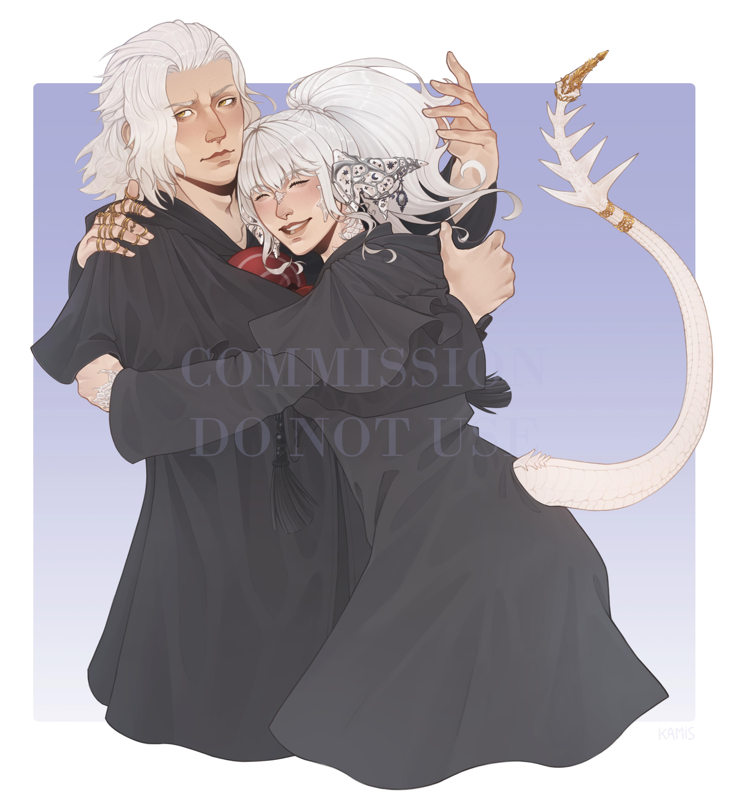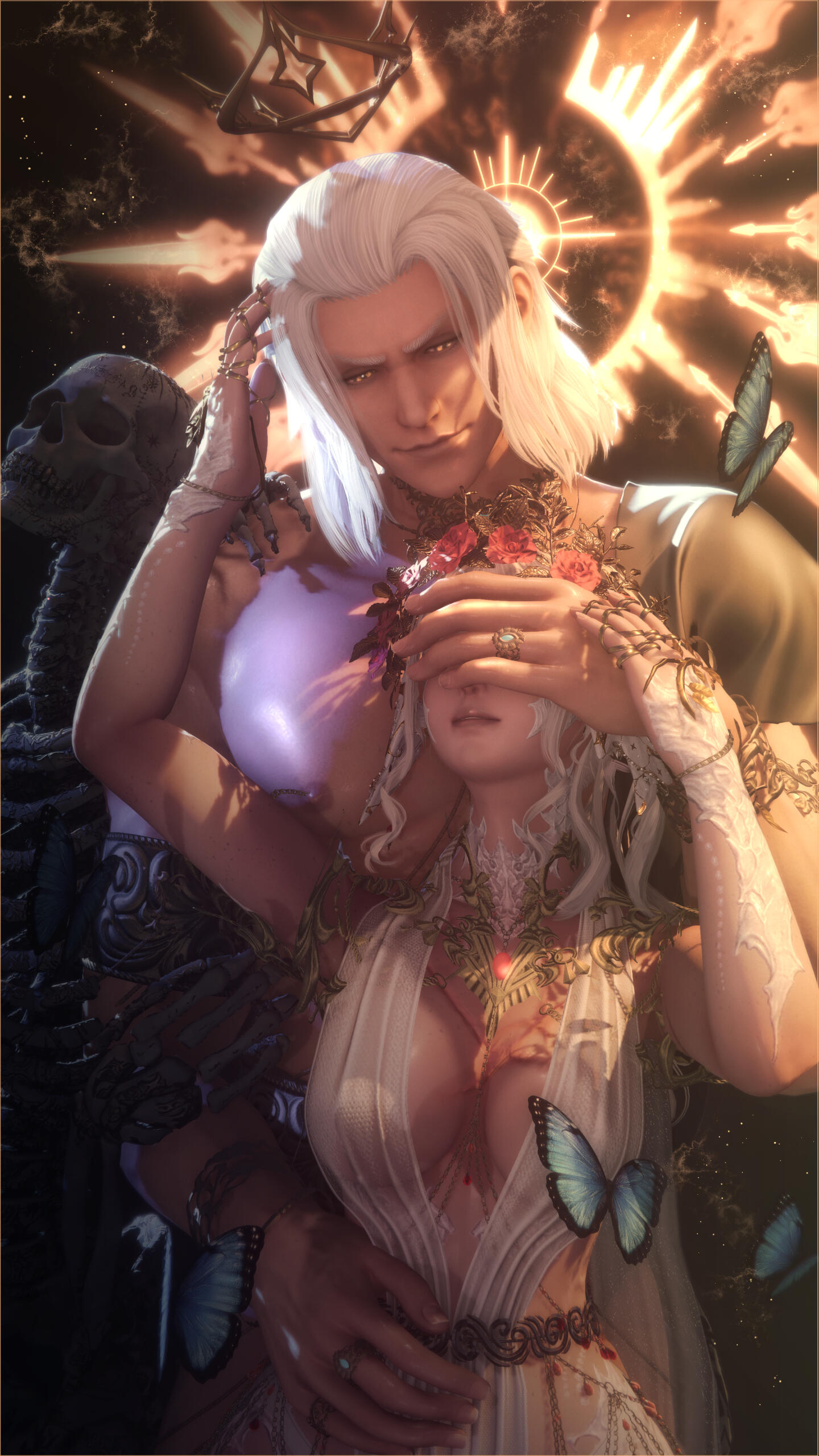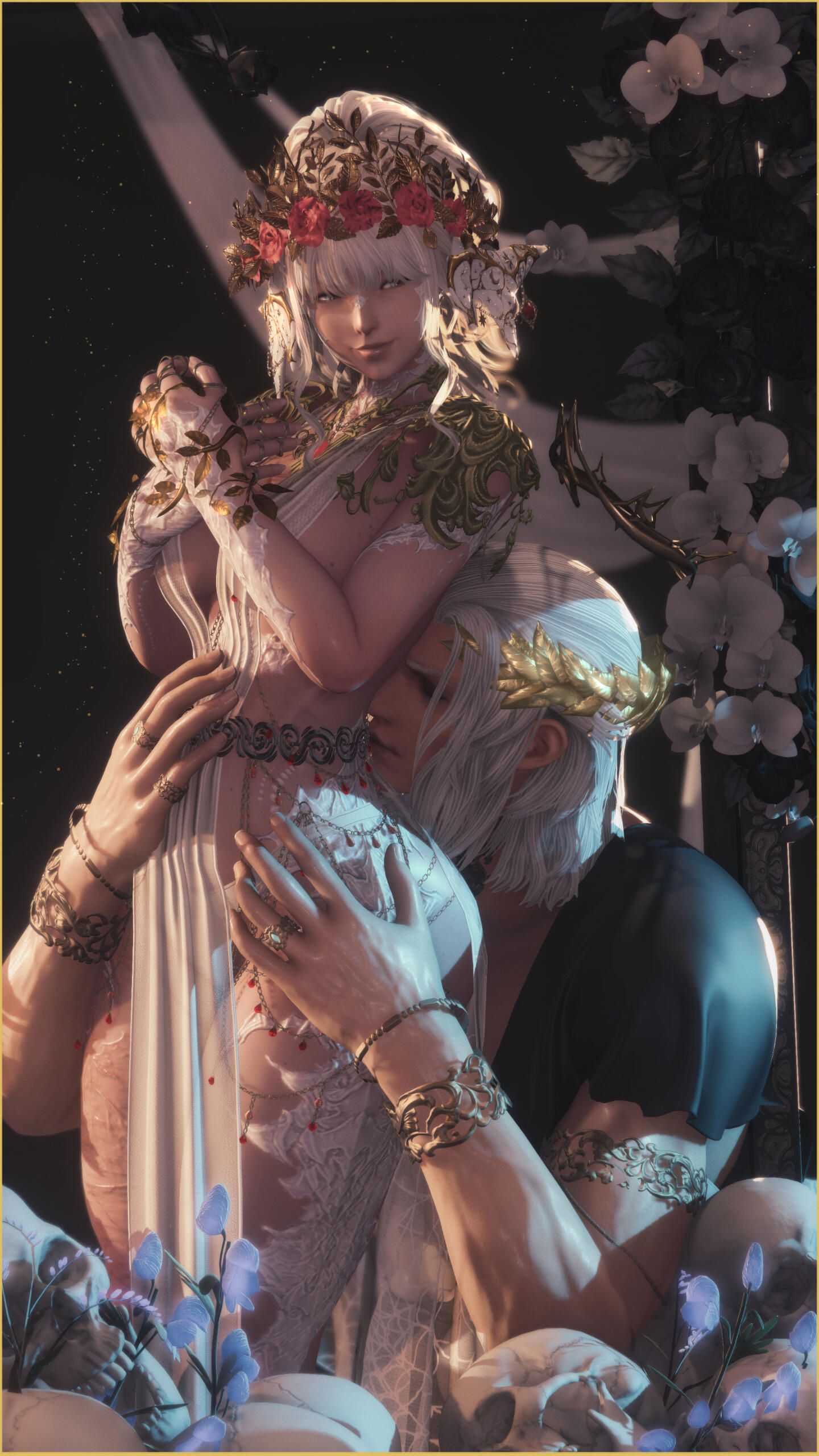 In the simplest terms, their relationship was complicated from the get go.Their first meeting was a whirlwind of emotions as they both experienced a strange pull to one another from the depths of their souls. Following this initial feeling - Athena was determined to ignore it and carry on with her duty, whilst Emet-Selch plotted to use this to his advantage, determined to slowly manipulate the esteemed Hero of the Source astray from her path.What followed was a secretive, intimate yet confusing string of meetups.Emet-Selch found himself observing Athena whenever he could, and started appearing to her during her moments of alone time. The first few meetups were met with hostility and caution; with the Ascian playing a game of how far he could push Athena's buttons. Soon enough, Athena also learned to play the teasing game of quips, and they both found themselves enjoying the company of the other, as it slowly developed into more intimate meetups where they got to know one another behind the masks of Hero and Villain. One meeting turned into several, often under the protection of the night where no one could interrupt them, and the pull between them became stronger and stronger.Regardless of their deepening bond, Athena felt guilty that she was keeping this big secret from the Scions. She feared she would be judged for 'conspiring with the enemy'. But despite the guilt, she couldn't help this strong pull she felt towards the Ascian. He began to see her for her. Not some Hero who was always put on a pedastal, but a person like everyone else. Despite the sorrow that plagued him, Emet-Selch didn't want to believe that the Warrior of Light was the shattered remanants of his dear friend, Minerva. They were complete opposites - sun and moon, day and night, chaotic and calming - but the closer he got to Athena, the more he began to see just how alike they actually were. When the Crystal Exarch began to suspect something was going on between the two, Emet-Selch proposed a new meeting opportunity - that he would whisk her away in the night to certain places in Amaurot away from prying eyes, and return her in the morning. Secretly, Emet-Selch was hoping that bringing Athena to these places would reawaken her memories as Azem, that there would be an opportunity to pull at those memories and persuade Athena to join him.Athena collapsed after the events of the fourth Lightwarden, and Emet-Selch took this opportunity to whisk her away completely, keeping her in his phantom Amaurot for some time. This was a turning point in their relationship.Athena, as much as she hated herself for it, didn't want to leave. She was frightened at what was to come, having tried so hard to hide her pain and fear from everyone around her. The mask of the Hero was crumbling, and this was a perfect moment for Emet-Selch to manipulate her to his side. He offered her an escape to the pressures she was facing, to join his cause at his side, and forget the woes of the broken world she lived in. To recreate a world of paradise.Until he realised the depth of his feelings he held for the Warrior of Light. He had planned his manipulation to the exact detail - what he didn't plan for was falling deeply in love with the Warrior of Light.Despite the feelings that harboured between the two, they still sat on the opposite ends of the moral compass.All those intimate moments together had intertwined them to levels not even he could comprehend. Fate had come in and bound the two of them with red string that no one could break. Athena caught glimpses of a man behind the burden he carried - caring, headstrong and driven by love. Still twisted by his duty however, the love had a nasty twist of possessiveness. Emet-Selch wanted Athena at his side always, no matter the cost. Athena knew she had to continue her duty, and the fury and obsession from Emet-Selch led him to stopping the Exarch from saving Athena from the light corruption. He wanted nothing more than to be the only one that Athena wanted - that Athena relied on, even with the disappointment he felt at Athena's failure to contain the light. After everything they felt towards another - the passion, the secret confessions - this was the ultimate betrayal in Athena's eyes.No matter how much they loved one another, they were both still bound by their duties. And those duties were always meant to be against one another.Heartbroken and shattered - and left with no other choice, Athena left for the Tempest alone. Feeling broken and guilty for taking up Emet-Selch's offer to die in the depths of Amaurot, Athena confronted him. All the love they held for one another had now been twisted into anger and despair as they realised they had always been doomed from the start when fate decided to bind them together.And the knife twisted deeper when Emet-Selch saw with his very eyes the confirmation that he had been ignoring all along - that Athena held Azem's soul, and she was more like Minerva than all the previous shards he had dealings with.Knowing that his love for Minerva - and now Athena, ran so deep that it forced him on the path of defeat, Emet-Selch did one final deed to save Athena's life. He made her use up the Light that was corrupting her soul to defeat him, putting an end to their conflict - and breaking Athena's heart into a million pieces.As he faded, leaving Athena with the words to 'Remember us' - Minerva's memories were restored, and Athena finally understood just how deep their connection went. As the weight of realization hit her as Emet-Selch began to fade away, Athena broke down as he left her alone in the ruins of Amaurot.Fate bound them together, and Fate tore them apart.